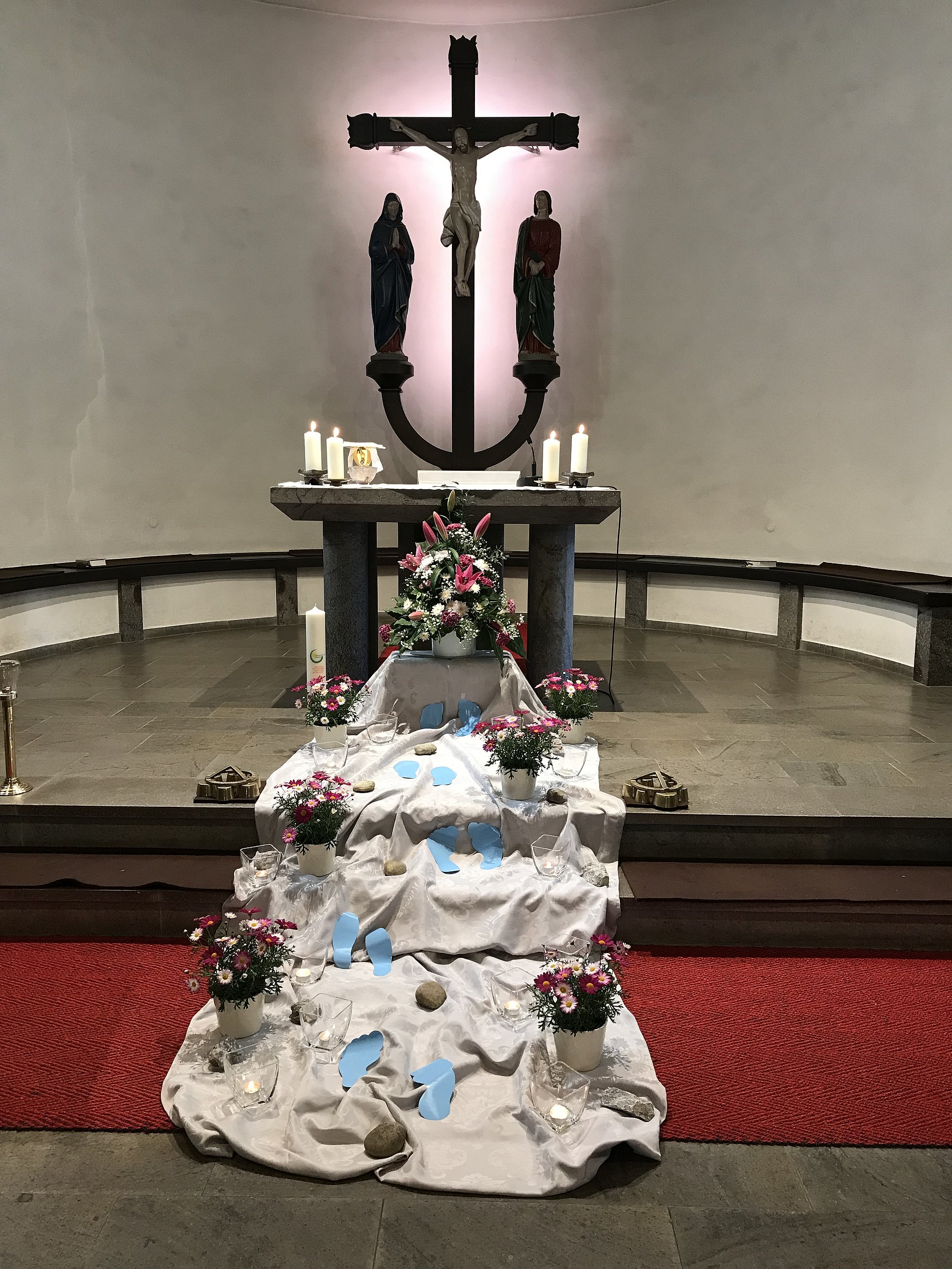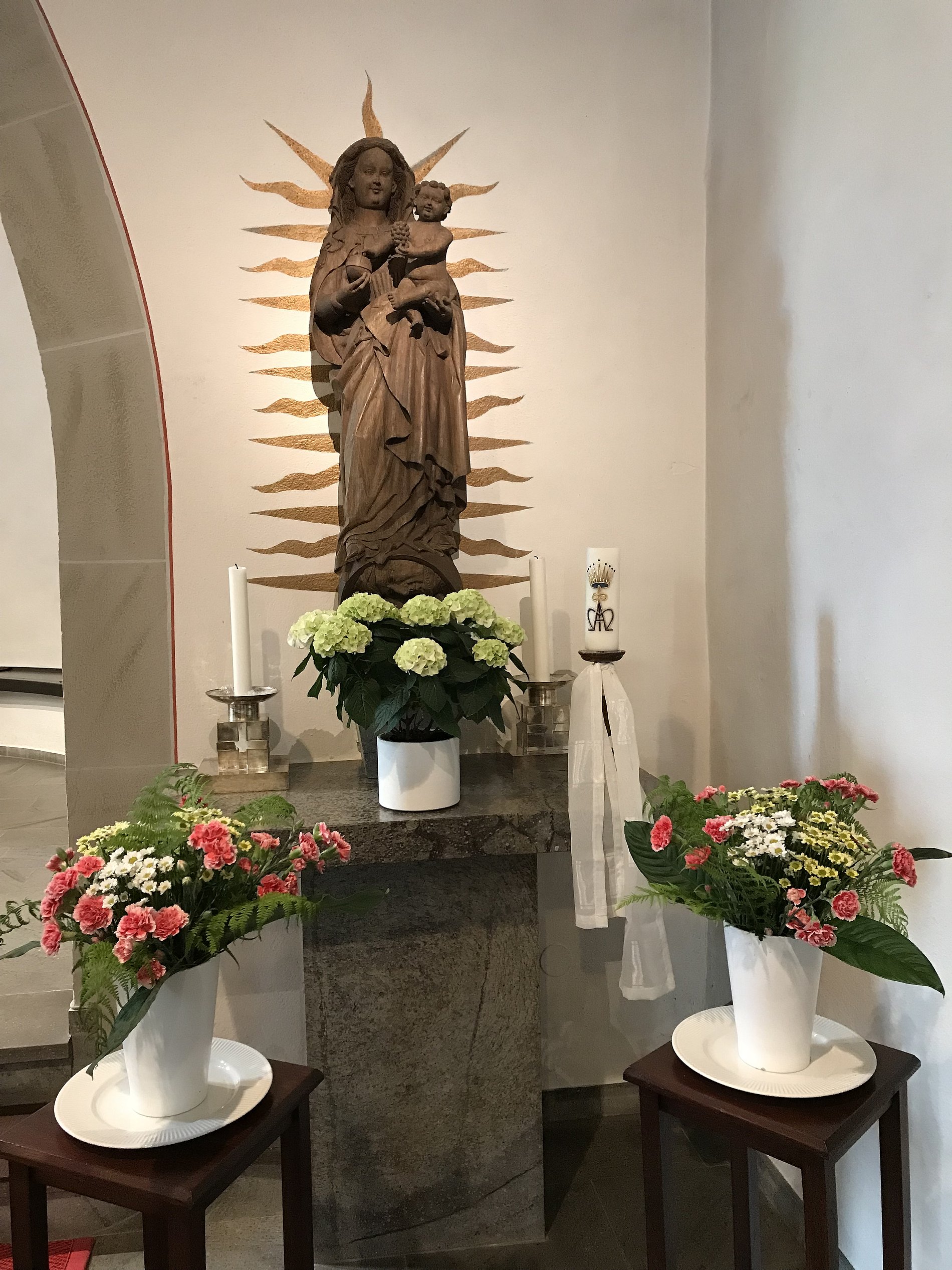 Der Tag begann mit einem Festgottesdienst in der Kirche St. Kilian. Der Gottesdienst wurde von den Frauen des Vorstandes unter dem Motto „Unterwegs in und mit der Frauengemeinschaft“ gestaltet. Unter der Leitung von Pater Jaison wurde unter anderem in einem Predigtgespräch die Stationen des Weges der Frauengemeinschaft von ihrer Gründung bis zum heutigen Tag noch einmal hervorgehoben.